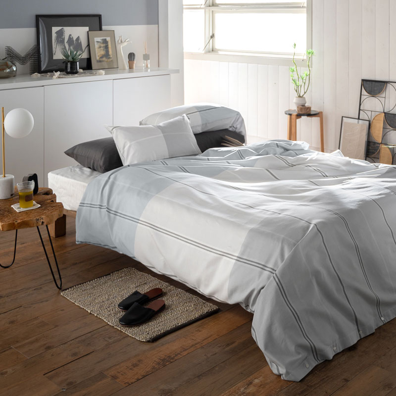 そのイメージを先染めの色糸で織り上げたツイル組織のブロックボーダー。